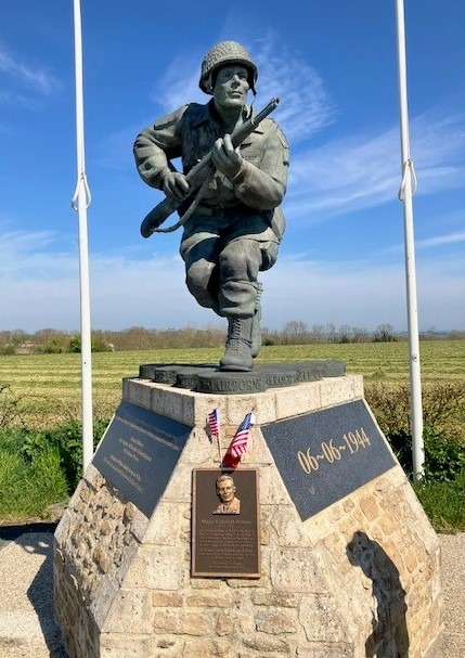 Standing in the square, we discussed the operational requirement to hold the flanks of the landing beaches, and at the west (American) end of the action, this was achieved by the dropping of some 13,000 paratroopers from the 82nd and 101st Airborne Divisions in the early hours of 6th June 1944.