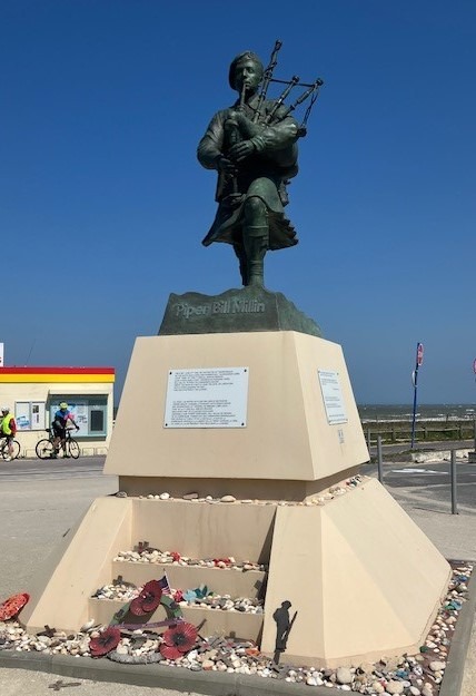 We then drove to Riva Bella Plage at Ouistreham, the eastern flank of Sword beach and the site of the landing by Lord Lovat’s Commando Brigade. It was here that Lord Lovat waded ashore piped by his personal piper, Bill Millin.