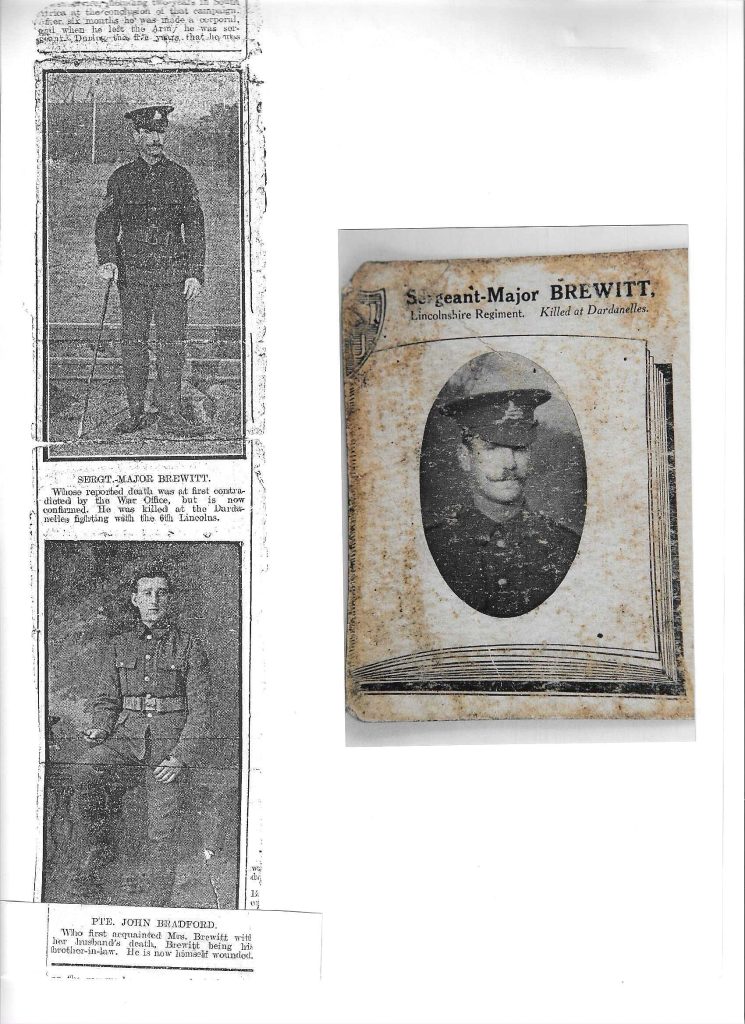 The many friends of Mrs. A. Brewitt, of 45, Victoria Street, Lincoln will learn with deep regret that her husband, Sergt.-Major Arthur Brewitt, has fallen on the field of battle. The first intimation of her sad loss was conveyed to Mrs. Brewitt by the Government notification form, which she received on Thursday. Mrs. Brewitt’s mother, however was informed of his fate in a letter dated August 16th, from her son, John Bradford, who wrote;-