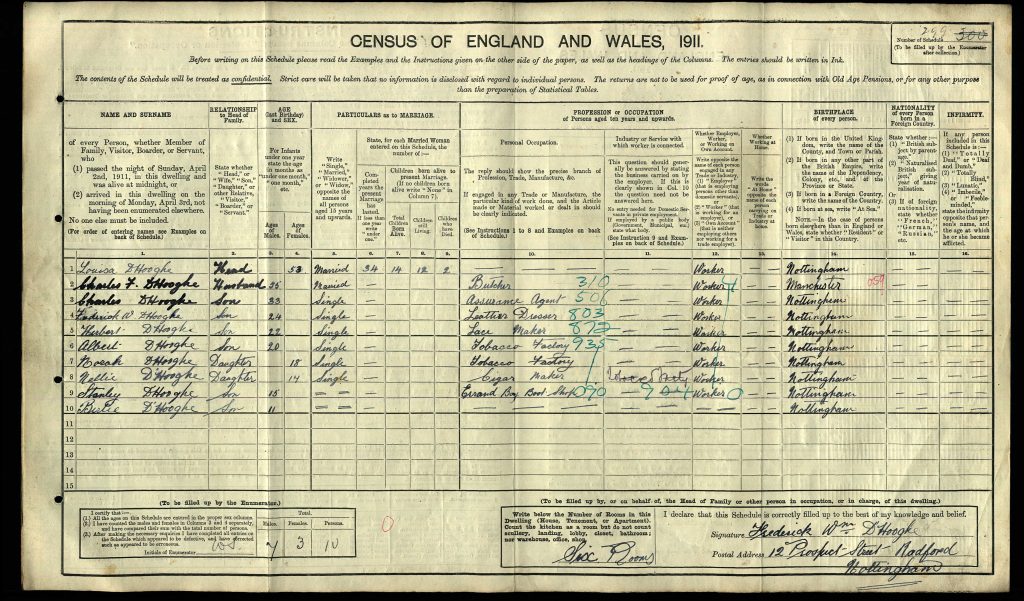 In the 1911 Census, Charles Ferdinand D’Hooghe’s large family are all single and living at home, apart from Leonard who is already in the army. Their address is 12 Prospect Street, Radford, Nottingham.