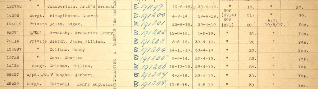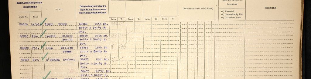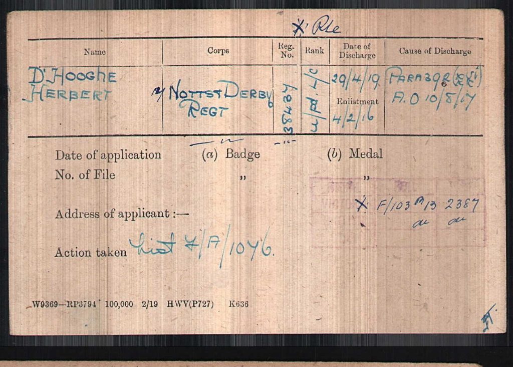 Unfortunately, Herbert’s Army Service Record has not survived but from the limited records that are available, we know that Herbert enlisted on 4th February 1916 and the Sherwood Foresters post-war Medal Roll shows that Herbert served with the 12th Battalion initially and later the 2nd/7th (Robin Hood Rifles) battalion as an unpaid Lance Corporal.