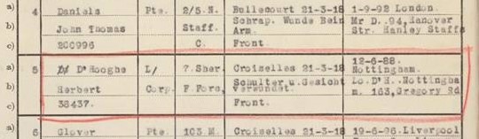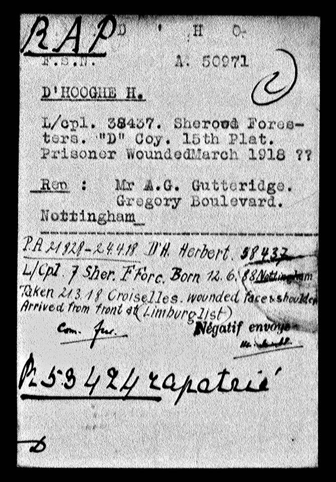 The International Red Cross records for British Prisoners of War show that Herbert was serving with 15 Platoon of D Company and that he was wounded in the face and shoulder when taken prisoner near Croiselles. His address was given as 163 Gregory Boulevard, Nottingham. He arrived at a POW camp at Limburg directly from the front.