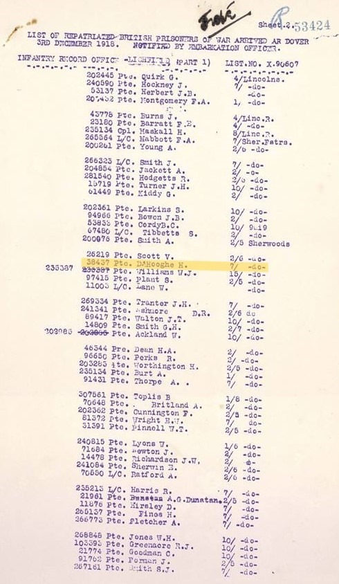 The Robin Hoods were approximately 660 strong on the morning of 21st March 1918 and during the fighting that morning, 171 men and officers were killed and 470 were wounded and/or taken prisoner, including the Commanding Officer Lt. Colonel Toller and Lance Corporal Herbert D’Hooghe. King George V inspected the remnants of the battalion a few days later and only 14 men answered the roll call.