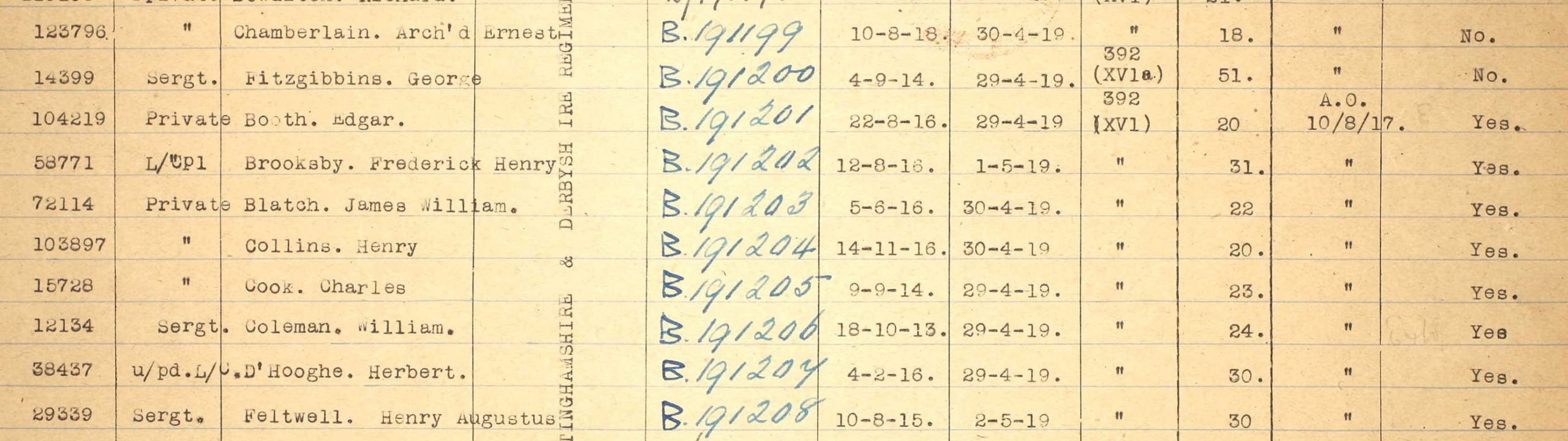 In the 1911 Census, Charles Ferdinand D’Hooghe’s large family are all single and living at home, apart from Leonard who is already in the army. Their address is 12 Prospect Street, Radford, Nottingham.