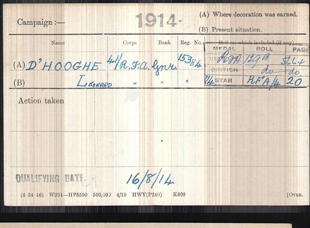 Posted initially to Newport, 15384 Gunner Leonard D’Hooghe joined 116 Battery of the Royal Field Artillery. His records are damaged and difficult to read, but it appears that he agreed to extend his service in 1904 and in due course, he received his Good Conduct chevrons and only had one minor blemish on his disciplinary record – In 1901 at the start of his service he ‘Neglected to obey an order’ and was confined to barracks for seven days.