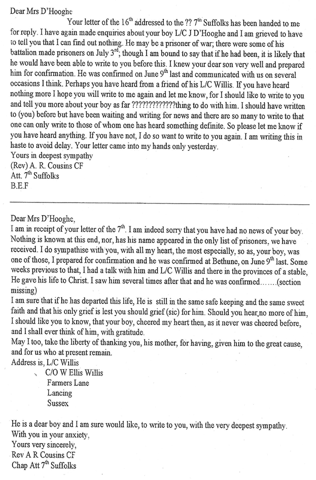 In July 1916 my great grandmother initially wrote to the battalion asking for information. I have two very fragile letters from the Battalion Padre to my great grandmother and they read as follows;