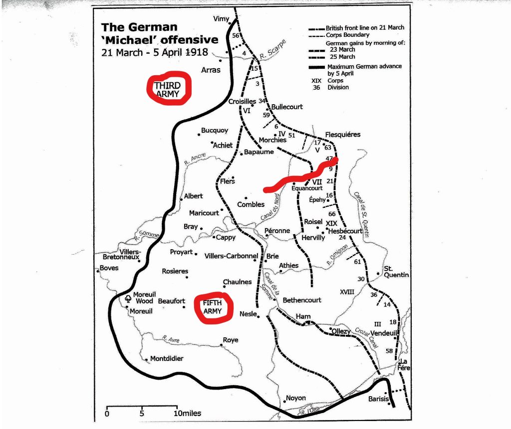 The ‘Kaiser’s Offensive’, as it was known, was unleashed in the early hours of 21st March 1918 with a huge and terrifying bombardment of high explosive and gas that rained down primarily on the British 5th Army front in and around St. Quentin, but also took in the southern most units of the British 3rd Army.